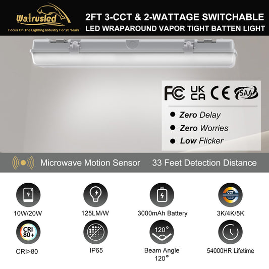 Walrusled 2 Foot Motion Sensor LED Wraparound Vapor Tight Emergency Batten Light, 3 CCT Power Selectable 10W/20W 1250lm/2500lm, Battery Backup, 3000K/4000K/5000K, IP65, IK08, Dimmable LED Wrap Waterproof Light, 60CM Flush Mount Vapor Proof Ceiling Fixture