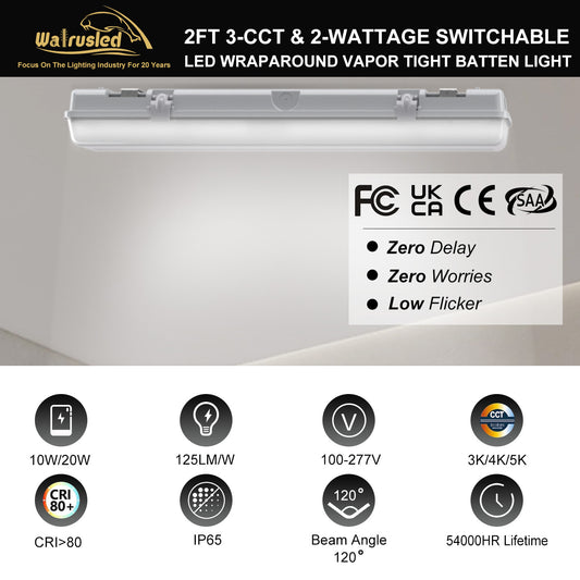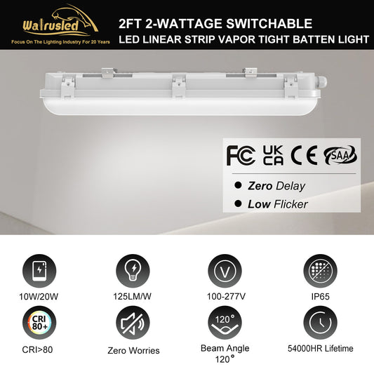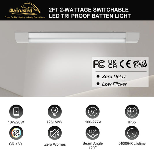 Walrusled 2FT Garage LED Linear Strip Vapor Tight Batten Light 2 Wattages/2 Lumens Selectable, 10W/20W, 1250lm/2500lm, 5000K, IP65, 100-277V, 2 Foot Stairwell LED Tri Proof Light Fixture, 60CM Flush Mount Tunnel Led Vapor Proof Batten Ceiling Light