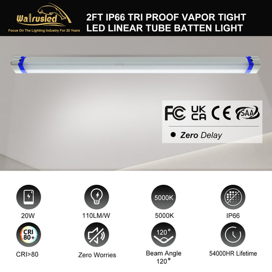 Walrusled 2FT Airport LED Tri Proof Batten Light, 20W, 2200lm, 5000K, IP66, IK10, 24 Inch Garage LED Vapor Tight Linear Tube Light, 2 Foot Tunnel LED Waterproof Dustproof Light Fixture, 60CM Flush Mount Stairwell Led Vapor Proof Batten Ceiling Light
