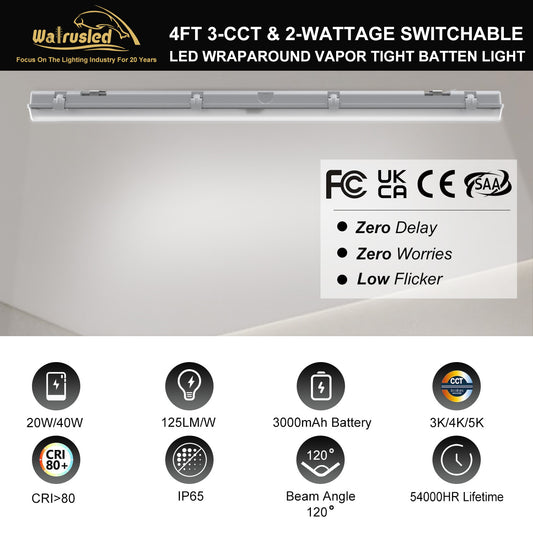 Walrusled 4FT LED Stairwell Wraparound Vapor Tight Emergency Batten Light, 3 CCT Power Selectable, 20W/40W 2500lm/5000lm, Battery Backup, 3000K/4000K/5000K, IP65, 4 Foot LED Wrap Waterproof Light Fixture, 120CM Flush Mount Led Vapor Proof Ceiling Light