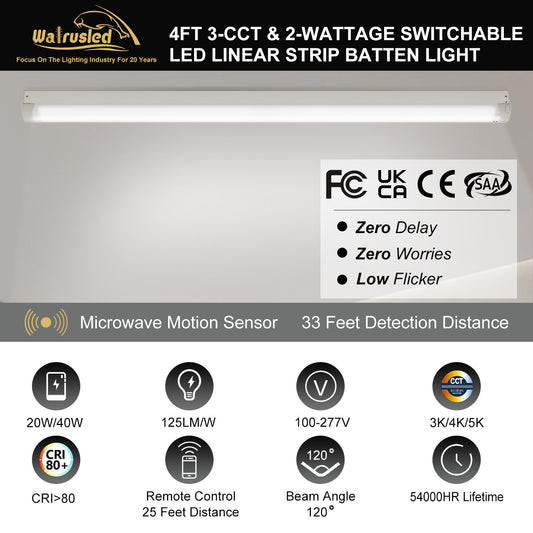 Walrusled 4FT Motion Sensor LED Linear Strip Batten Light with Remote, 2 Wattages/2 Lumens/3 CCT Selectable, 20W/40W, 2500lm/5000lm, 3000K/4000K/5000K, Dimmable 4 Foot LED Shop Batten Pendant Light Fixture, Flush Mount Garage Hallway Ceiling Batten Light
