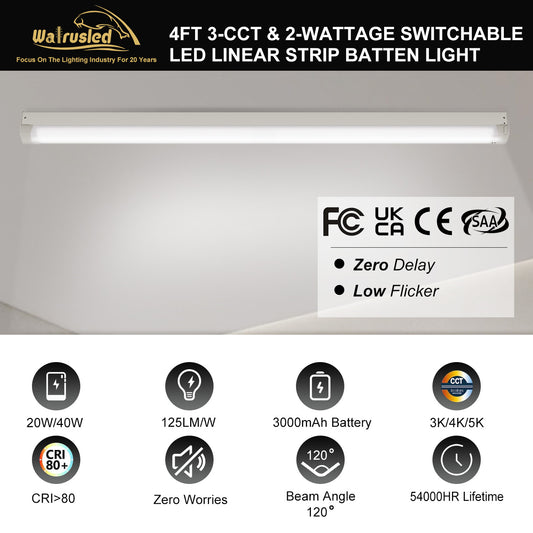Walrusled 4FT LED Linear Strip Emergency Batten Pendant Light Fixture, 3 CCT Power Selectable 20W/40W 2500lm/5000lm, Battery Backup, 3000K/4000K/5000K, IP20, Flush Mount 4 Foot LED Shop Garage Workshop Hallway Stairwell Strip Ceiling Batten Light Fixtures