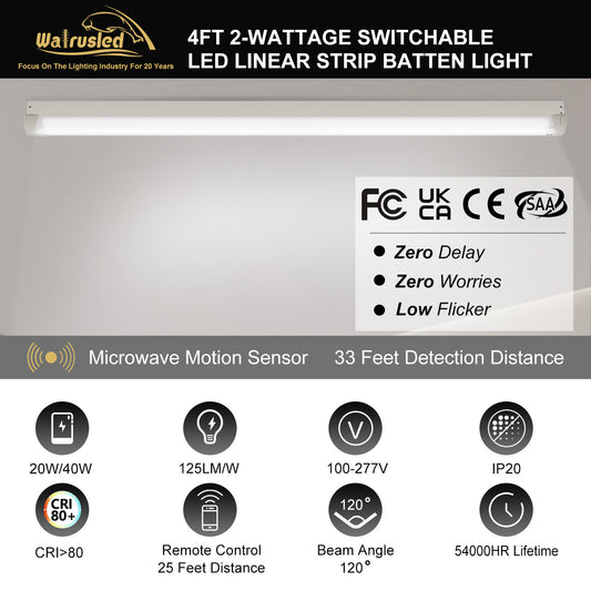 Walrusled 4FT Motion Sensor LED Linear Strip Batten Light with Remote, 2 Wattages/2 Lumens Selectable, 20W/40W, 2500lm/5000lm, 5000K, 100-277V, Dimmable 4 Foot LED Shop Strip Batten Pendant Light Fixture, Flush Mount Garage Workshop Ceiling Batten Light