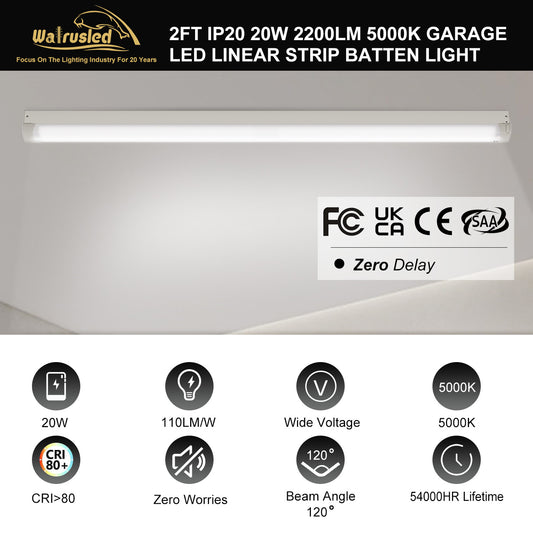 Walrusled 2FT LED Kitchen Linear Strip Batten Light Fixture, 20W, 2200lm, 5000K, IP20, 24 Inch LED Garage Linear Strip Light, 2 Foot LED Shop Linear Strip Light Fixture, 60CM Flush Mount LED Workshop Restaurant Spa Hallway Stairwell Batten Ceiling Light