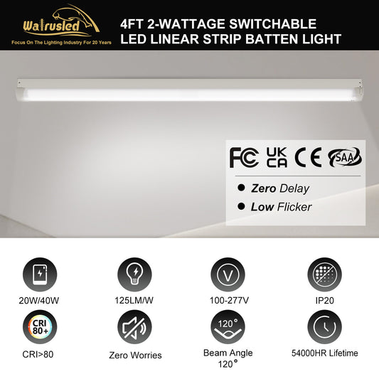 Walrusled 4FT LED Linear Strip Batten Light Fixture, 2 Wattages/2 Lumens Selectable, 20W/40W 2500lm/5000lm, 5000K, 100-277V, IP20, 4 Foot LED Shop Strip Batten Pendant Light, Flush Mount 120cm Garage Workshop Hallway Stairwell Batten Ceiling Light Fixture