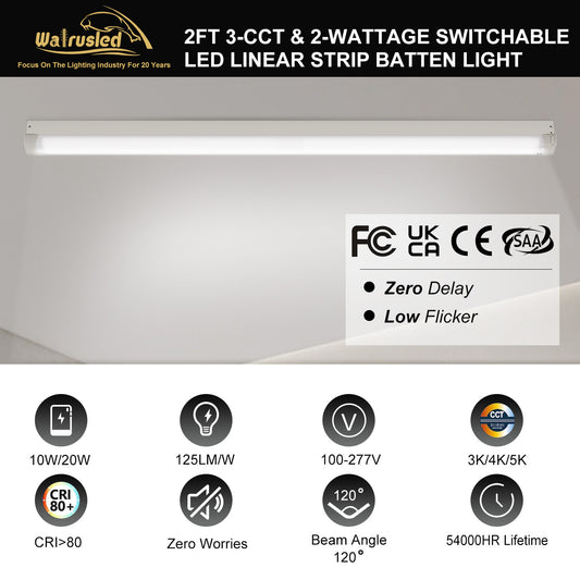 Walrusled 2FT LED Linear Strip Batten Light Fixture 2 Wattages/2 Lumens/3 CCT Selectable, 10W/20W 1250lm/2500lm, 3000K/4000K/5000K, 100-277V, 2 Foot LED Shop Linear Strip Batten Light Fixture, 60CM Flush Mount Garage Hallway Stairwell Batten Ceiling Light